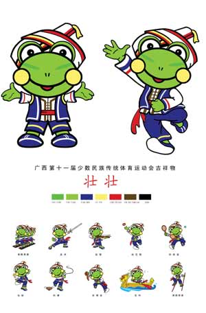 广西壮族自治区第11届少数民族运动会吉祥物确定为一只活泼可爱的卡通拟人化青蛙,取名“壮壮”。青蛙是壮族人民最崇拜的图腾青蛙是壮族十二图腾中的第一图腾,春秋战国时代,在西瓯人中已占据保护神的地位。直到近现代,一些地方的壮族人对蛙仍然敬若神明,认为是雷王派到人间来帮助呼唤雨水的。所以壮族先民铸造的铜鼓鼓面上常有蛙的立体雕塑,特别是河池所辖的东兰、巴马、天峨、凤山等地还保留有祀蛙的"蚂节",以祈求风调雨顺,稻作丰收。